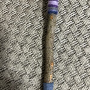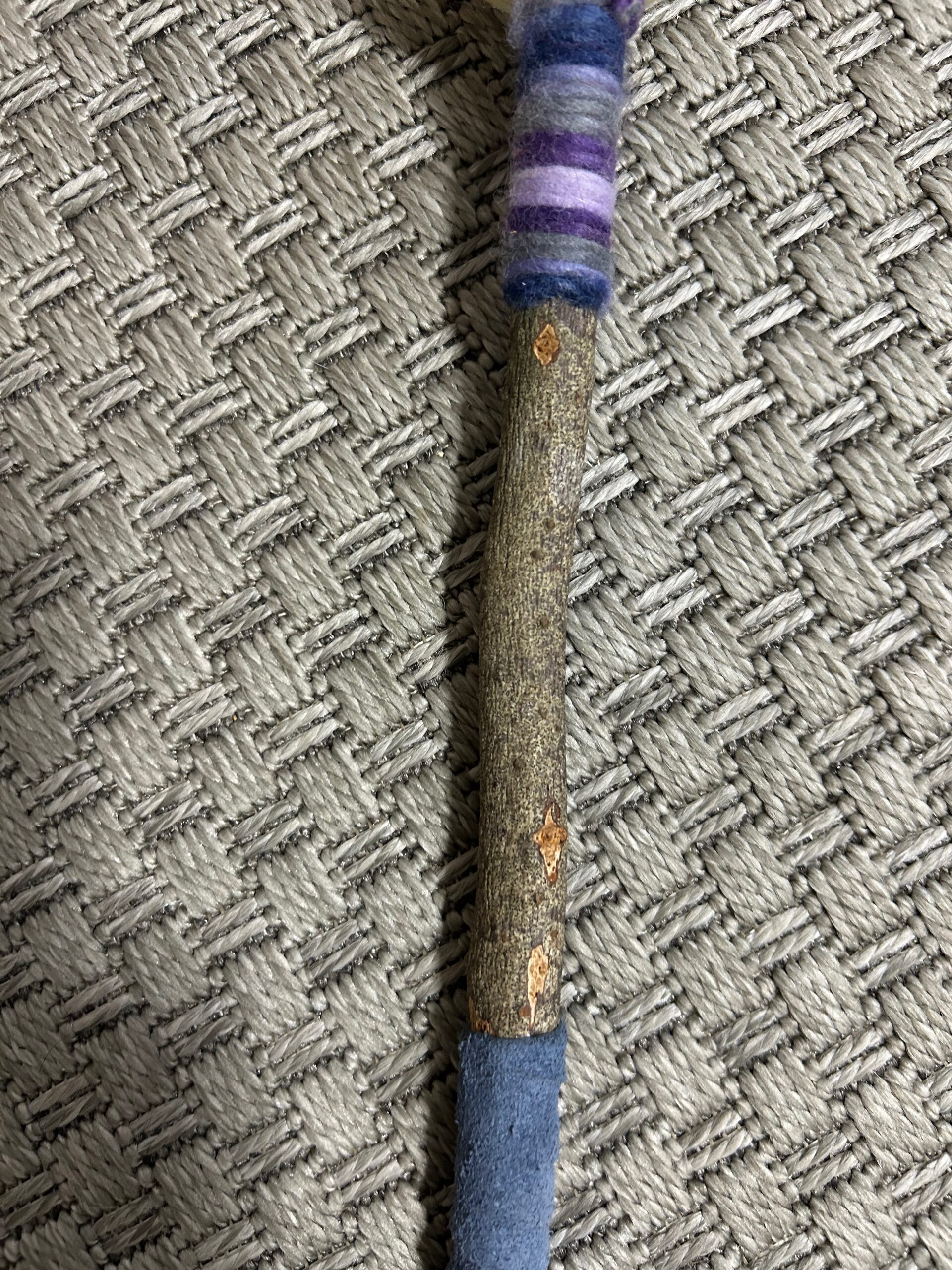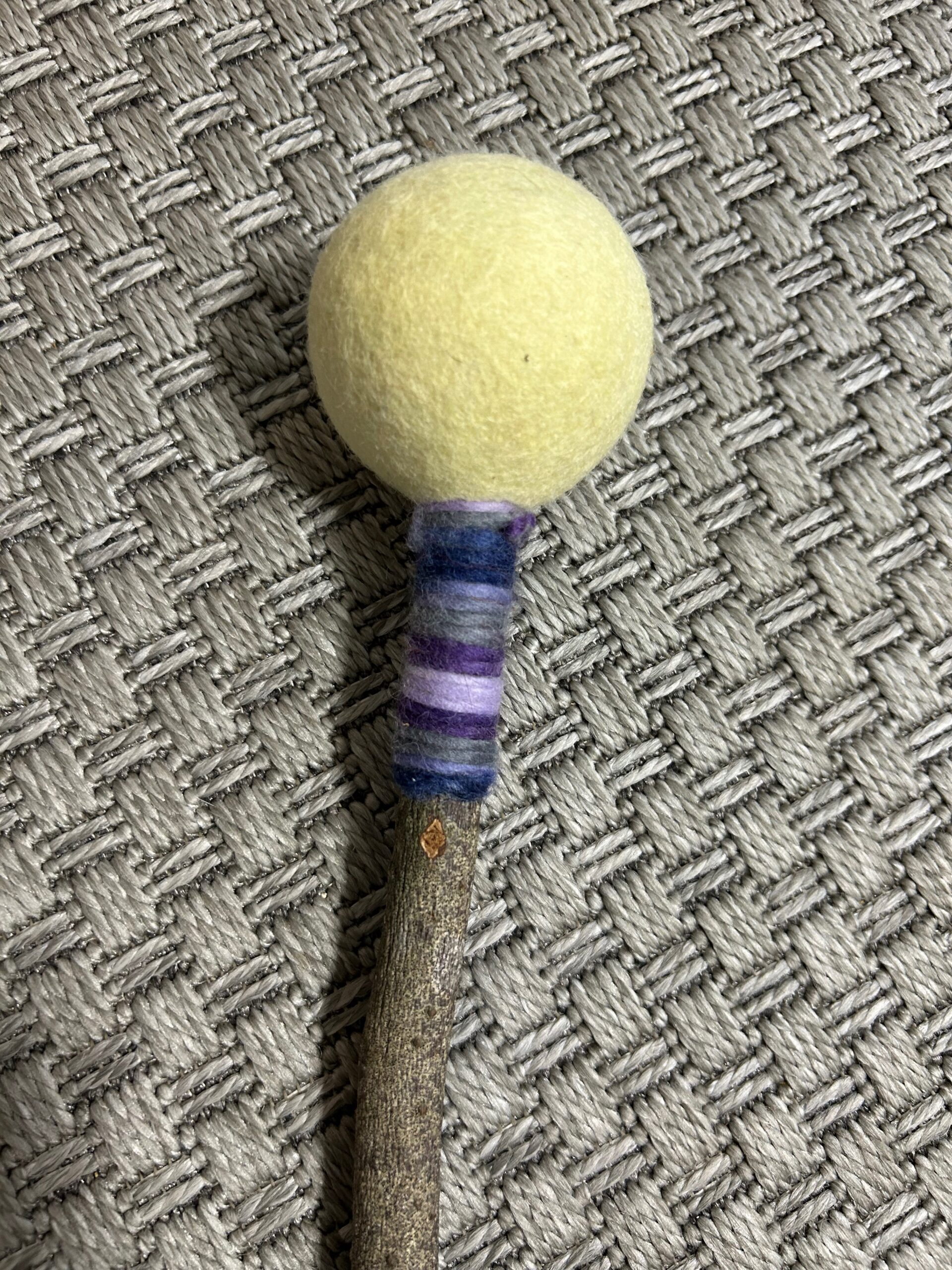 Klöppel ca. 40cm mit Wollschnüre und blauen Lrdeeinband, Filzball in Hellbeige.